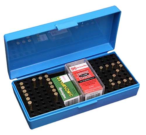 The SB-200 was not only designed for 22 rifle small bore competitors, but also for varmint hunters and plinkers. It will easily hold 100 rounds in the down position for easy access during competition. Space in the center is available which can hold two full 50 round boxes. The SB-200 holds up to 250 rounds of: 22 Long Rifle, 22 Long or 17 Mach 2; 200 rounds of 22 Win. Mag. or 150 rounds of 17 HMR. The SB-200 features a Snap-lok latch and a fold-down handle for easy transporting to the field or range.