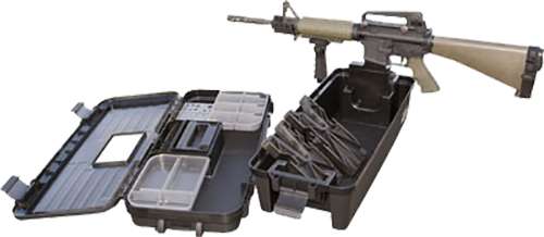 MTM's Tactical Range Box uses a two-piece design with a removable top storage box suitable for stowing all of your small cleaning items such as oils, solvents, brushes, patches and the like. Unlatch the top box to reveal a deep-storage maintenance center, where you can stash your larger items, such as ammo, powder, etc. The Tactical Range Box is designed to help you service both bolt action and AR style rifles. It includes a standard front and rear gun fork with overmolded rubber padding for rifles and shotguns and a mag well fork for AR-15/M16 style rifles. Its overall length of the Shooting Range Box provides excellent stability for nearly any size firearm, as well as room for hard to fit items like collapsible cleaning rods or tripod extensions.
