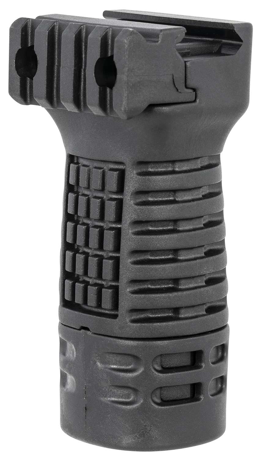 This textured mid-length vertical grip is compatible with 1913 Mil-Std Picatinny side accessory rail. It is made of quality reinforced polymer with storage compartment.
