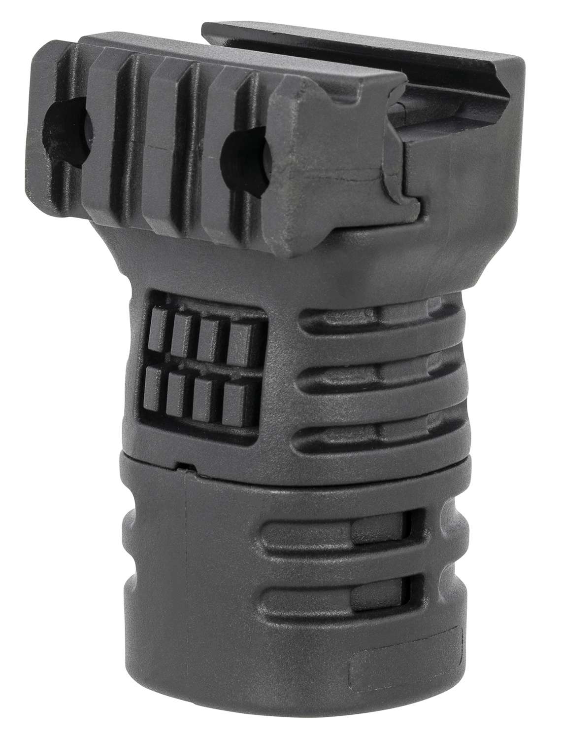 This textured short vertical grip is compatible with 1913 Mil-Std Picatinny side accessory rail. It is made of quality reinforced polymer with storage compartment.