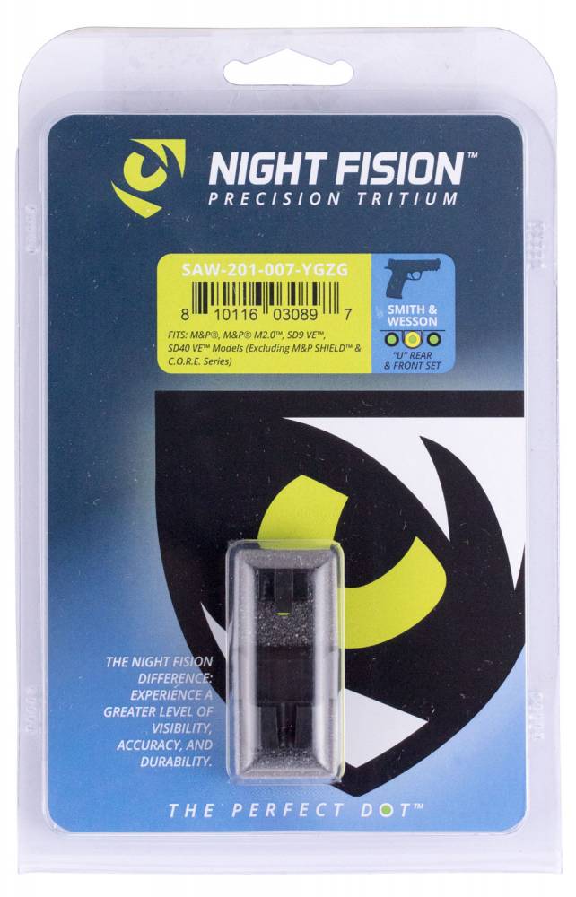 This Perfect Dot night sight set is a square front with green tritium and yellow outline and a black u-notch rear. It is compatible with S&W M&P/M&P M2.0/SD9 and 40 VE (excluding M&P Shield and CORE models).