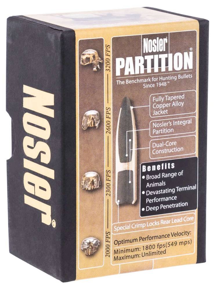 Every Partition bullet in the Nosler line is engineered with an optimum length, weight and ogive design for maximum in-flight and terminal performance. The fully tapered copper-alloy jacket ruptures instantly at the thin mouth, yet the gradual thickening along the bullet's axis controls expansion and curls the jacket uniformly outward at high and low velocities. Nosler's integral partition supports the expanded mushroom and retains the rear lead alloy core. Enclosed rear core retains more than half the original bullet weight for deep penetration. Special crimp locks add strength to resist deformation under the pressure of heavy magnums.