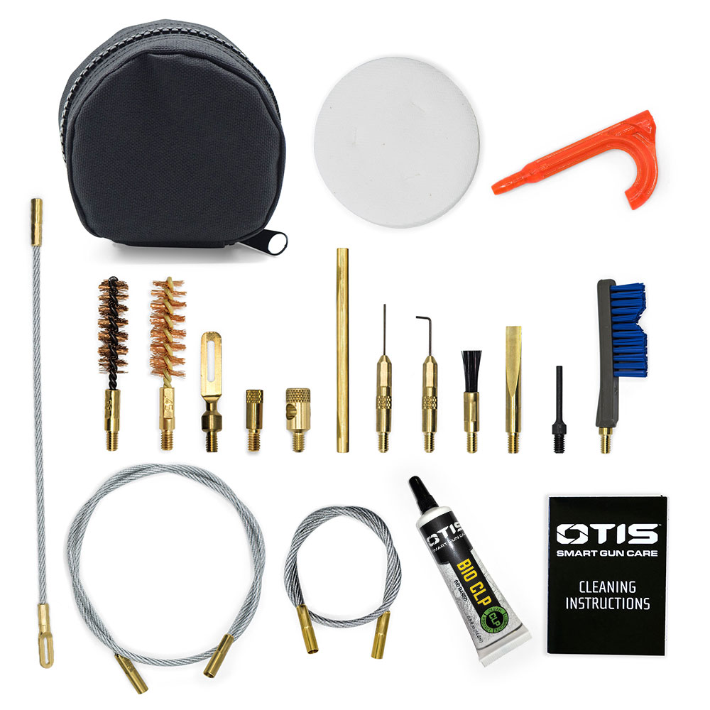 Duty-built for professional shooters, as well as military and law enforcement personnel, the Otis® Professional Pistol Cleaning Kit keeps your firearms clean and in top-notch condition for superior performance. Caliber-specific bore brushes quickly remove carbon, copper, and lead fouling, while 8” and 12” Memory-Flex® cables with thread connectors allow for a proper Breech-to-Muzzle® clean. Unique panoply cotton patches, coupled with durable slotted tips and proprietary patch savers®, are designed to penetrate deep into lands and grooves for a more reliable clean, and improved performance. An obstruction removal tool quickly removes performance-inhibiting blockages for safe operation and improved accuracy. Packed and organized in a lightweight 4” x 4” x 2.5” soft pouch, this cleaning kit also includes a pin punch, straight and curved locking lug picks, scraper, mini nylon end brush, short AP brush, and male and female rods for a more precise clean. Plus, this professional kit is backed by Otis’ No Nonsense lifetime warranty.