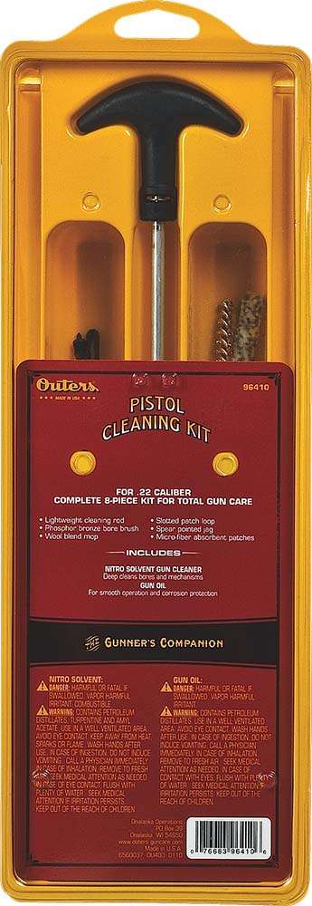 Easy-to-use Aluminum Rod Pistol kit includes lightweight cleaning rod; phosphor bronze bore brush; wool blend mop; spear pointed jag; slotted patch loop; micro-fiber absorbent patches; Nitro Solvent Gun Cleaner 2oz and Gun Oil 2oz.