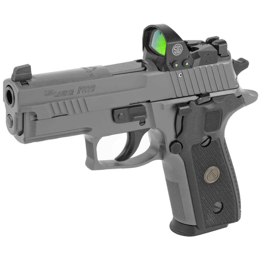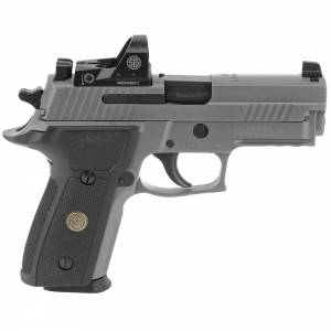 The Legion P229 Legion RX is equipped with a slide-mounted reflex optic, the ROMEO1. The pistol is finished in Cerakote Elite Legion gray coating, custom G-10 grips with a Legion medallion, the new SIG SAUER Electro-Optics X-RAY high visibility day/night sights and will ship with three magazines. The P229 in DA/SA include a reduced and contoured Elite beavertail, which allows for a higher grip, but a reduced profile, thus eliminating printing. More aggressive front strap checkering and additional checkering under the trigger guard enhance the grip. An X-Five undercut has been applied to the trigger guard, allowing for a higher grip and greater control. Front cocking serrations provide greater purchase for cycling the action, clearing the firearm, or conducting press checks. An enhanced polished action with the SRT (Short-Reset Trigger) is augmented with a Grayguns, Inc. designed P-SAIT trigger.