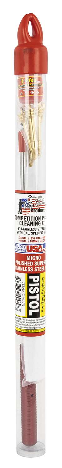 This cleaning kit features a rod, patch holder, patches, jags, brushes, and solvents. The multi-caliber cleaning kit works great when it comes to cleaning your handguns after a long day at the range. This kit works with .38, 9mm, .40, 10mm, and .45 caliber handguns.