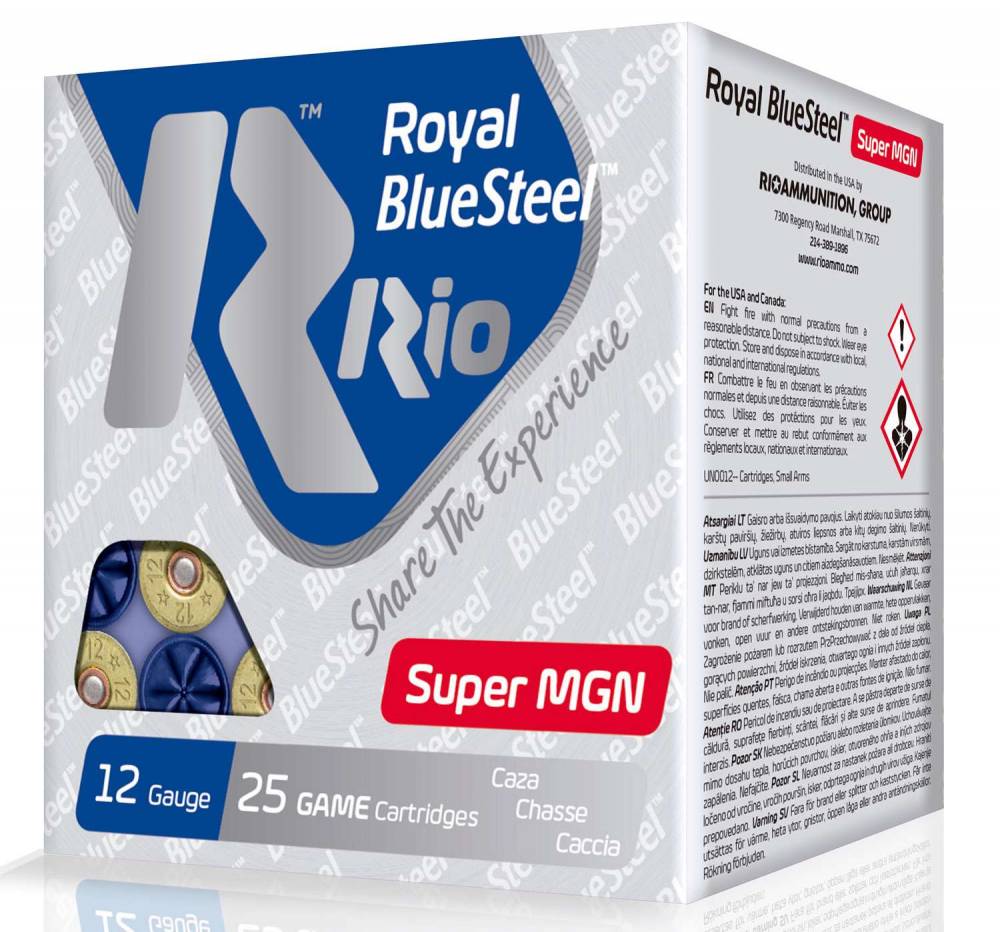 RIO's Royal BlueSteel Game Load excels in performance with powders and cartridge wads that are specifically designed for the challenges of steel shot ensuring reliable performance and results. High velocities, perfectly spherical steel shot and multiple shot sizes give you the killing power you need under adverse hunting conditions. RIO's Royal BlueSteel Game Load provides great patterns and superb knockdown power combined with an eye-catching steel design. This super magnum 12 gauge load has a BB shot size.