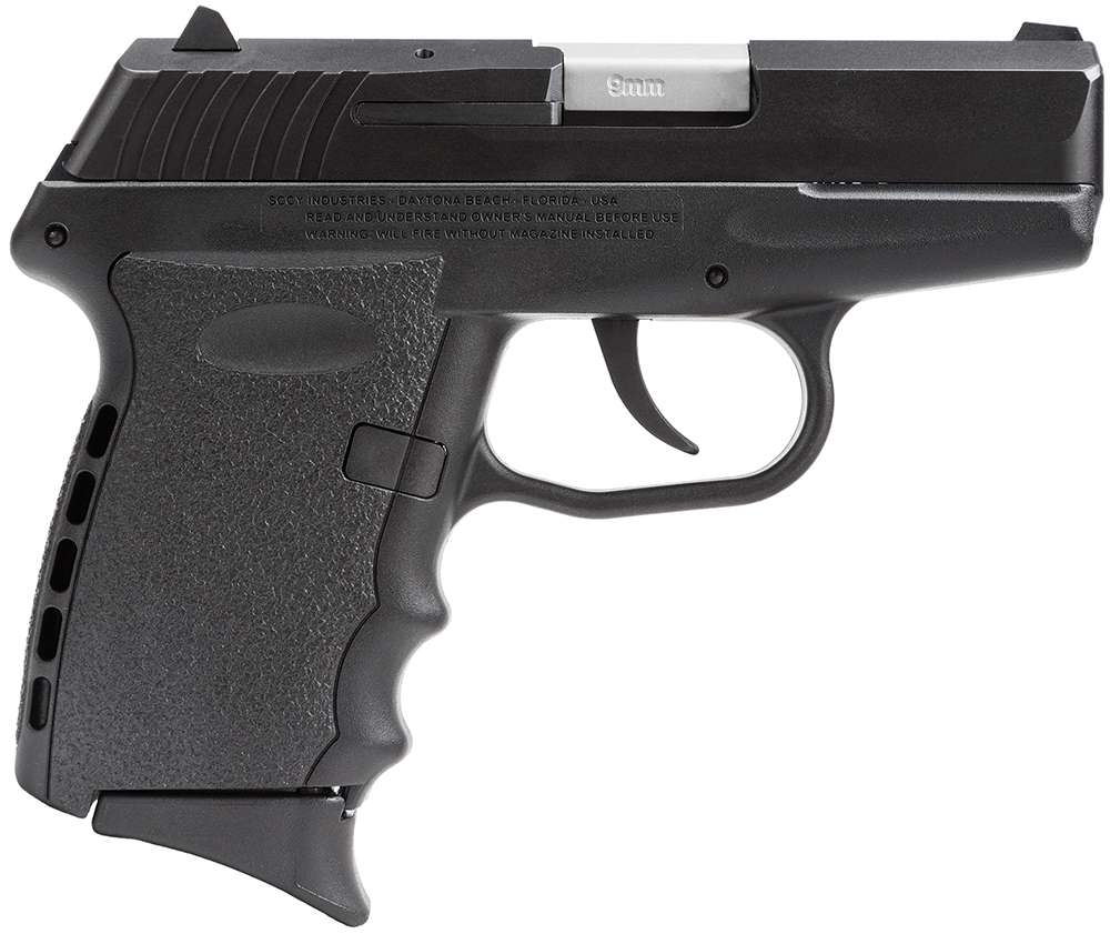 SCCY's CPX-2 is designed for concealed carry but large enough to get a good firm grip. It is considered to be one of the best priced, precision made "Pocket Pistols" on the market. Chambered for 9mm, it has a 3.1" barrel with a 16:1" right hand twist. The receiver is made from 7075 T6 aircraft grade heat treated aluminum alloy. The Zytel polymer frame features ergonomic finger grooves and an integral recoil cushion on the backstrap. The slide is machined from stainless steel with a Zytel overmolded polymer extension for ease of operation. It has 3-dot sights with a windage-adjustable rear. This DAO has an internal hammer with inertial firing pin to prevent accidental discharge. It has a smooth, consistent 9-pound trigger pull. It comes with two 10-round magazines with finger extensions bases installed and two flat magazine bases. This CPX-2 has a black nitride slide with a black frame.