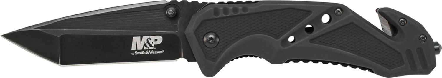 This knife features a black 7Cr17MoV high carbon stainless steel tanto blade with ambidextrous thumb knobs and thumb rest jimping.