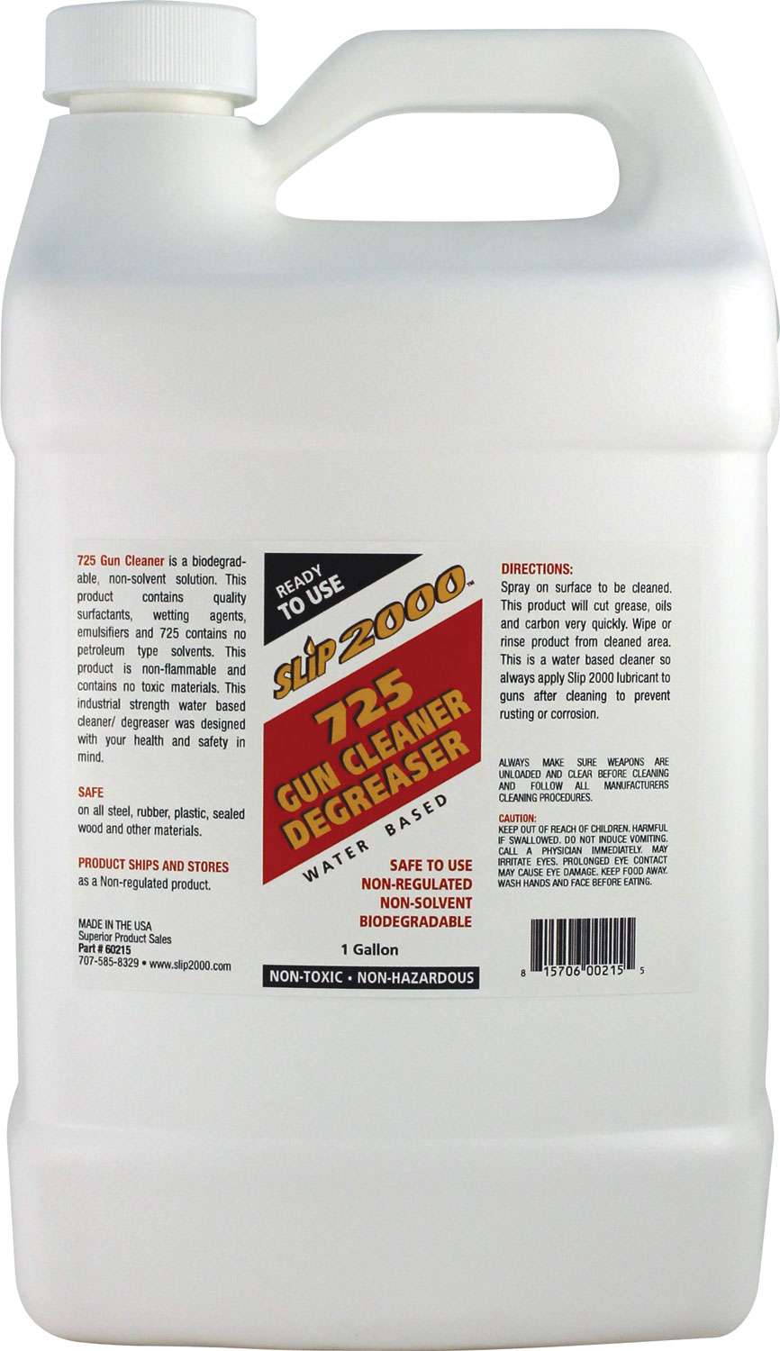 725 Gun Cleaner should truly be called Super Degreaser judging from the way it out-performs competitive products. This cleaner will cut through the toughest cosmoline, carbon, grease and grime! Its super strength allows it to de-gum and de-gunk the dirtiest of gun parts when sprayed on or used in parts washers or solvent tanks!