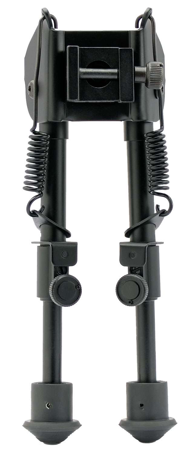 SME's Shooting Bi-Pod with Spring features a clamp mount for easy attachment to firearms with picatinny/weaver style rail. It is supplied with butt stud adapter to attach to firearms with a standard butt stud and an additional butt stud on adapter for swivel attachment. The adjustable spring-loaded legs are constructed of anodized 6061-T6 aluminum with a spring locking knob and soft rubber feet for stability.