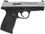 The stainless steel slide features front and rear serrations and has 3-dot white sights. This two-tone model has a black frame with a satin finish stainless steel slide, and a 10-round magazine, and is CA and IL compliant.