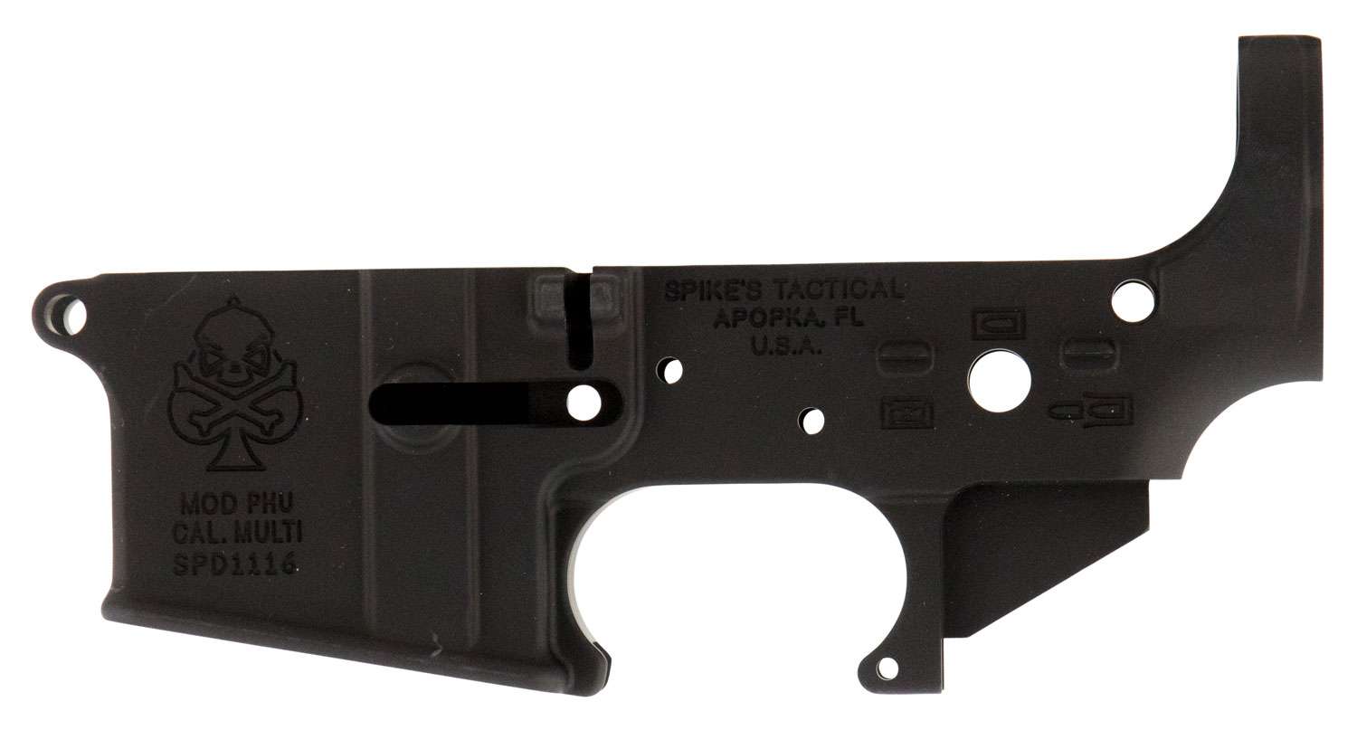 Spike's Tactical stripped lower is made to the highest standards. Forged from 7075 T6 aluminum it supports multi-calibers, has a black hard coat anodized finish, low shelf, and is RDIAS compatible. This model features a PHU Joker logo with a spade.