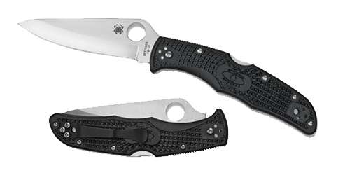 Spyderco Endura Knives are favorite everyday carry and work knife for folks who are serving and saving professionals as well as many other hands-on professions. Last year they gave it a new flat grind and changed the blade steel to VG10. The scales are black FRN with a volcano grip texture and it has the standard David Boye locking lever dent. The black clip can be positioned for left/right tip up carry.