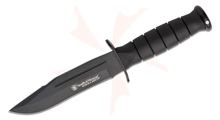 The Smith Wesson SW-CKSUR1 Search Rescue Knife features a 5.88" modified clip point blade made of 440 stainless steel. The blade has a blood groove, a non reflective black titanium powder coating, and the Smith Wesson Search and Rescue logo. The rubberized aluminum handle has grooves for secure grip, forward bending metal cross guard and butt cap. The heavy duty nylon sheath is constructed with a hard synthetic liner and metal reinforcements. The sheath also includes a D ring, lashing slots, and a front mounted nylon storage pouch with Velcro closure. Overall length: 10.5". Weight: 7.4 ounces.br /br /Specifications:br /br /- Duel Edged Clip Point Bladebr /- Deep Grooved Black Rubber Wrapped Handlebr /- Black 7Cr17 High Carbon Stainless Steelbr /- Handle Color: Blackbr /- Blade Length: 6.03"br /- Handle Length: 4.47"br /- Overall Length: 10.50"br /- Weight: 0.44 lb.