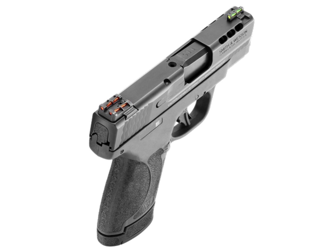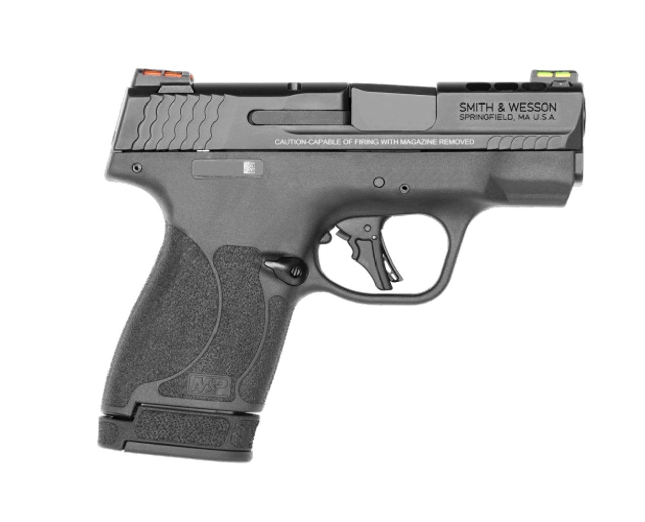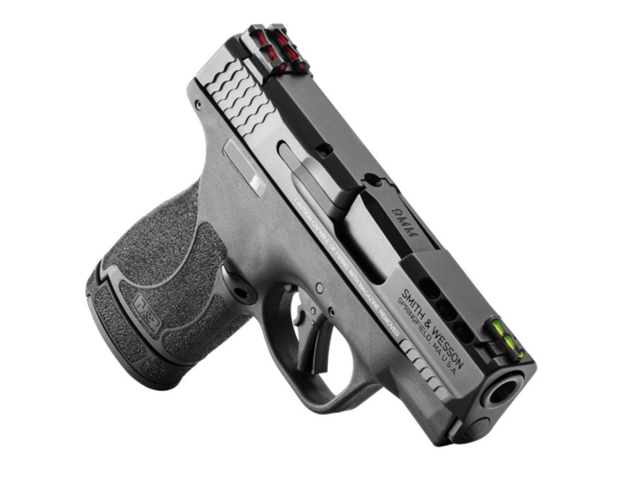Smith & Wesson's latest micro-compact includes red/green fiber optic sights, ported barrel, (1) 10-round standard magazine and (1) 13-round extended magazine, an all-new flat face trigger for more accurate, repeatable shot placements, and an enhanced redesigned textured grip. *The #13254 model will include a thumb safety