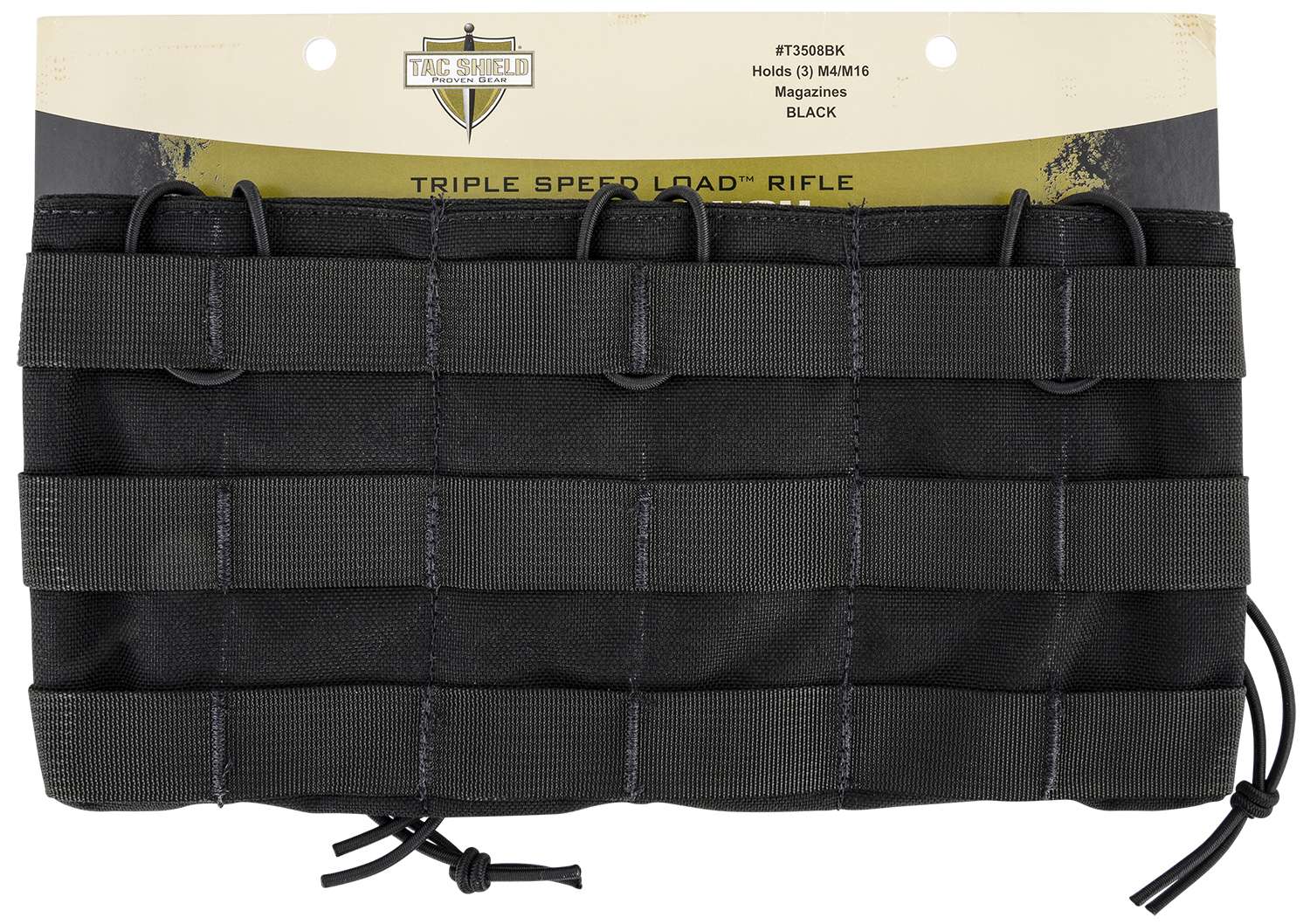 Triple SPEED LOAD MOLLE Rifle Magazine Pouch is designed with durability and fast reloading of your rifle in mind. Constructed with tough 1000 Denier Nylon exterior and blackened grommets that serve as convenient drain holes. Magazines are retained with top quality elastic cords and convenient pull tabs. Just flip them over when needing quick access when things get fast and furious.