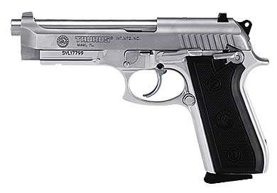 The Taurus 92 has specially-designed drop hammer-forged ordnance-grade alloy frame won't crack or allow the slide to come off, and a three-position frame-mounted ambidextrous safety allows for a classic single action "cocked-and-locked" mode and also functions as a double action decocking lever. The Taurus 92 also features a loaded chamber indicator, the Taurus Security System, a Picatinny rail, and fixed 3-Dot sights. This 92 has black grips and a stainless steel finish.