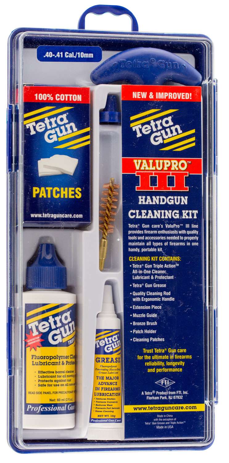 ValuPro III cleaning kits offer the highest quality and versatility available on the market today, all in an attractive, significantly more compact case packaging. This kit includes Triple ActionTM, Tetra Gun Grease, bronze brush, cotton patches, patch holder, cleaning rod and silhouette pistol extension.