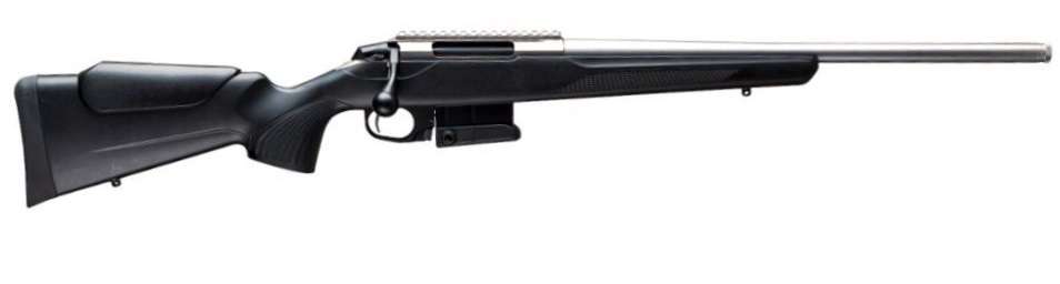 Tikka rifles are innovative, durable, and can perform under 1 M.O.A accuracy. The Tikka T3x product family combines long-standing gunsmith expertise with the real experiences of Tikka hunters and sport shooters from all over the world. The modular synthetic stock has interchangeable pistol grips (sold separately), making it possible to modify the angle of the grip for multiple shooting positions, and an additional attachment point allowing you to change the width of the stock's forend. Other improvements include a widened angular ejection port, extra screw placements on top of the receiver to securely attach a Picatinny rail, and a robust recoil pad. The T3x Compact Tactical Rifle (CTR) offers high performance in all situations. It has a durable aluminum trigger guard and a magazine release lever enabling rapid magazine changes. Its compact size, Picatinny optic rail, Teflon bolt and semi-heavy barrel contour with 5/8x24 muzzle thread make this rifle a reliable tool for all training purposes and as a hunting rifle. It features a 10-round steel magazine and comes standard with vertical angled grip for prone shooting. This model has a 20" stainless steel barrel.