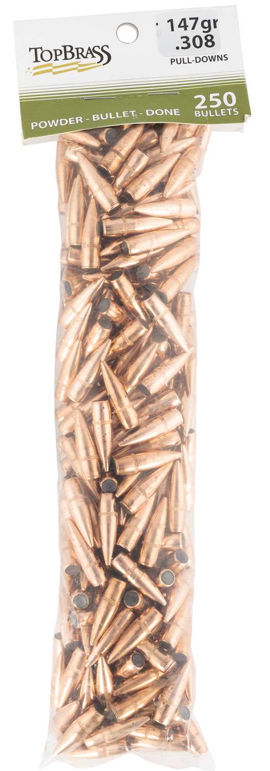 .308 147 grain Full-Metal Jacket projectiles. These are pull-downs removed from unused military cartridges. Ideal for 7.62 NATO, .308 Winchester, .300 Blackout and other popular .30 cal rounds.