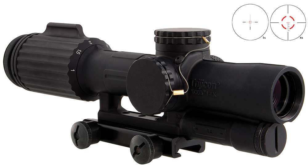 The Trijicon 1-6x24 VCOG (Variable Combat Optical Gunsight) is a rugged variable powered riflescope that accommodates close quarter battle (CQB) and long distance marksmanship. It features superior glass quality and light gathering capabilities with zero distortion. The bullet drop compensating and ranging reticles allow for the shooter to quickly and accurately estimate range and apply the correct hold. Its first focal plane reticle allows the subtensions and drops to remain true at any magnification. With a forged 7075-T6 aircraft-aluminum-alloy housing, the VCOG is an exceptionally durable and nearly indestructible sighting system. It utilizes a single AA battery, commonly found across the globe and offers 6 adjustable brightness settings for the LED reticle. When powered by a lithium AA battery (like the one provided), it boasts a considerable battery life of 700 hours at setting 4(constant on). A constant eye relief means no head or stock position adjustments are needed. Waterproof for up to 20 meters (66ft), the VCOG comes standard with a quick-release mount for any 1913 Picatinny rail.
