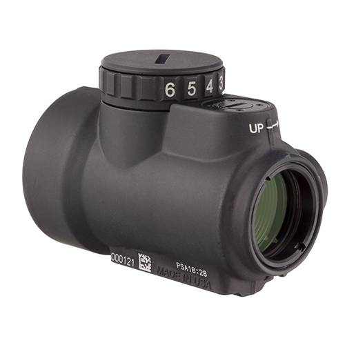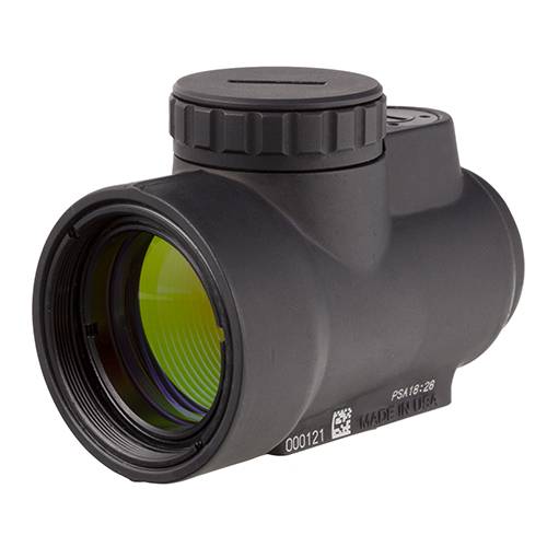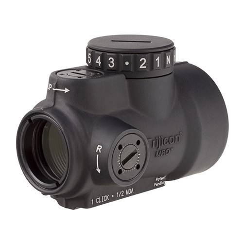 The Trijicon Miniature Rifle Optic (MRO) is a reflex-style, sealed sight intended for use on rifles, carbines, and shotguns. It is designed to be used with both eyes open, providing the operator with maximum situational awareness. The large aperture and tapered light path maximizes the viewing area in such a small optic, allowing for fast target engagement, especially from non-standard shooting positions. Advanced lens coatings and electronics produce a crisp red dot. The brightness control dial on the MRO is specifically designed for ambidextrous usage. With a mid-adjustment 'off' position and eight discernible brightness settings, this brightness dial allows for quick and ergonomic adjustments. The MRO features fully protected adjusters that maintain zero even during rough handling, and can be adjusted without the need for special tools. The hard-anodized, forged 7075-T6 housing is fully sealed and waterproof. This model has a 2.0 adjustable MOA green dot reticle.