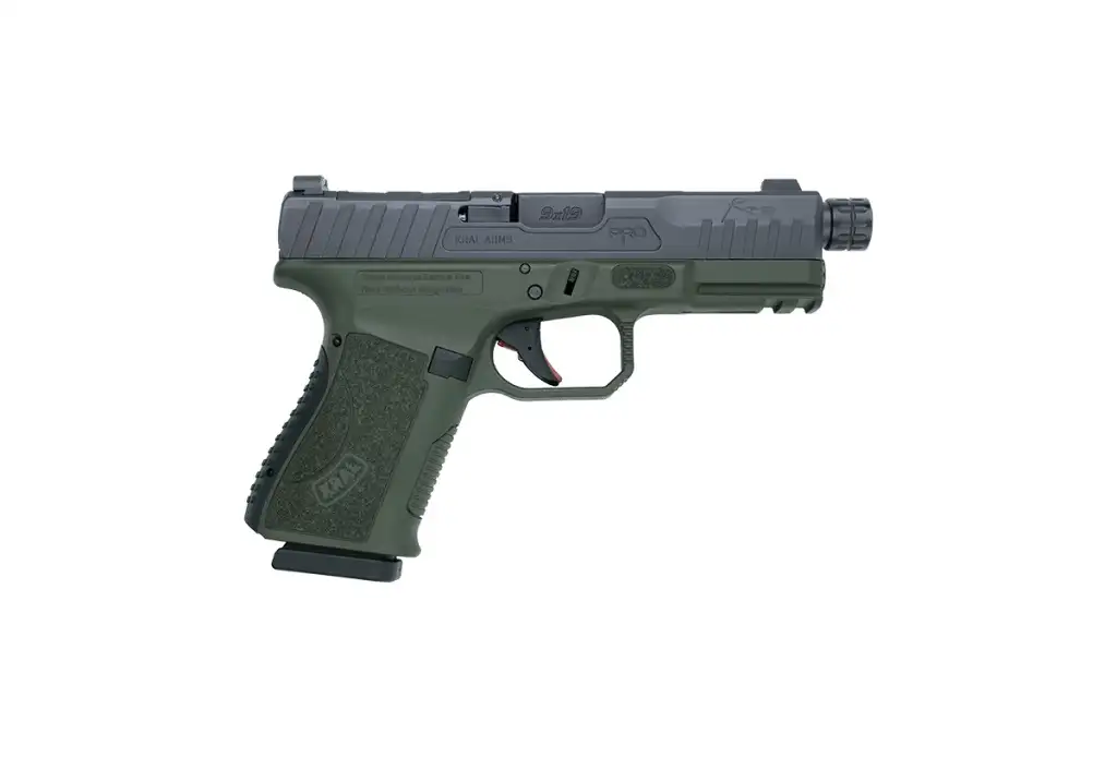 TriStar APOC Pro, Striker Fired, Semi-automatic, Polymer Frame Pistol, Compact, 9MM, 4.48" Threaded Barrel, 1/2X28 Thread Pitch, Matte Finish, Black Slide, Olive Drab Green Frame, Fiber Optic Sights, Optic Ready, 15 Rounds, 2 Magazines, Includes Magwell Attachment 85786