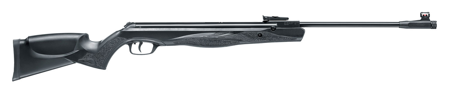 Umarex's Walther Parrus air rifle features a Hi-Grip finish on the grip and forearm, adjustable match trigger, and a spring piston break barrel. Included is a Truglo fixed front and adjustable iron rear sights, automatic trigger safety, and a rubber recoil pad.
