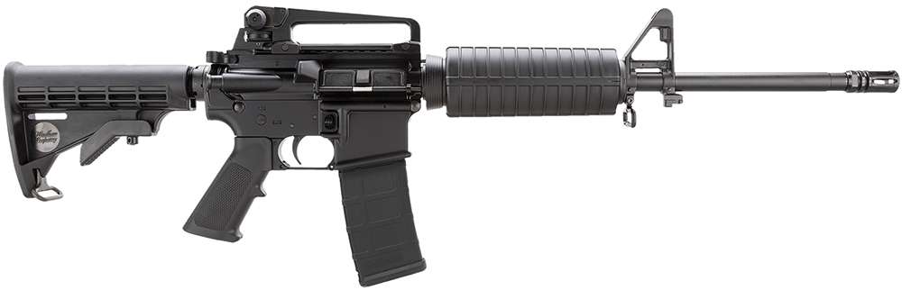 Windham Weaponry .223/5.56mm Model R16A4T has a M4A3 flat top upper receiver and detachable rear sight/carrying handle. Chromed 16" barrel made of 4150 steel in M4 contour or heavy barrel. M4 double heat shield hand guards. with 6 position telescoping buttstock and aluminum trigger guard. Fixed front sight.