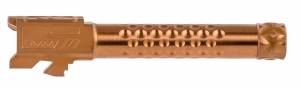 ZEV Technologies Optimized Match Barrels have been redesigned for improved performance compatibility. Enhanced features include a recessed target crown, a new match chamber, and a stylized barrel hood with caliber and model engravings and a loaded chamber indicator. ZEVs proprietary broach cut 1 in 14 left hand twist rifling was developed to create the most accurate Glock aftermarket barrel available, and testing confirms a significant increase in accuracy over factory barrels in all standard bullet weights. Manufactured from 416R stainless steel which is an ideal material for making match grade barrels because the material allows for the precise cutting of chambers and rifling which results in a more accurate barrel.